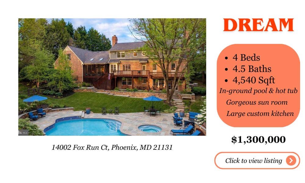 🏠 For sale: $1.3M brick colonial on Fox Run Court in Phoenix. 4,540 square feet, 4 beds, 4.5 baths. Resort-style backyard with in-ground pool, hot tub, and multi-level patio. Listed by Dicky Gaines