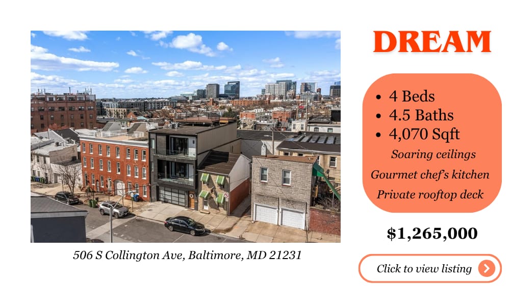 🏠 For Sale: A 4-bed, 4.5-bath luxury rowhouse in Canton — 4,070 sq ft of wide-plank hardwood floors, soaring ceilings, and a gourmet chef's kitchen with quartz countertops and a massive island. The rooftop deck has sweeping city skyline views and glimpses of the waterfront. Priced at $1,265,000.